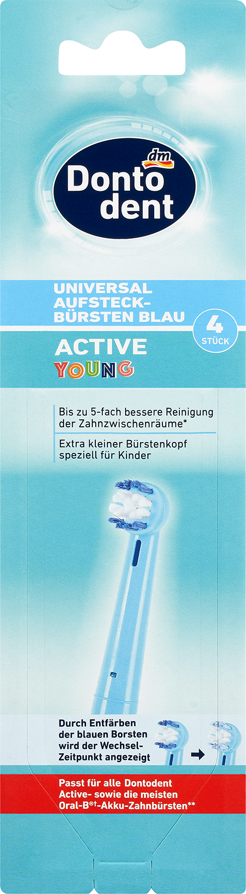 توفر فرش Active Young العالمية باللون الأزرق من Dontodent تنظيفا أفضل بما يصل إلى 5 مرات للمسافات بين الأسنان مقارنة بأداء تنظيف فرشاة الأسنان اليدوية التقليدية للأطفال *. رأس الفرشاة الصغير مخصص للأطفال ويناسب جميع فرش الأسنان اللاسلكية Dontodent Active. تتلاشى الشعيرات الزرقاء للإشارة إلى الوقت المناسب لاستبدال الفرشاة.