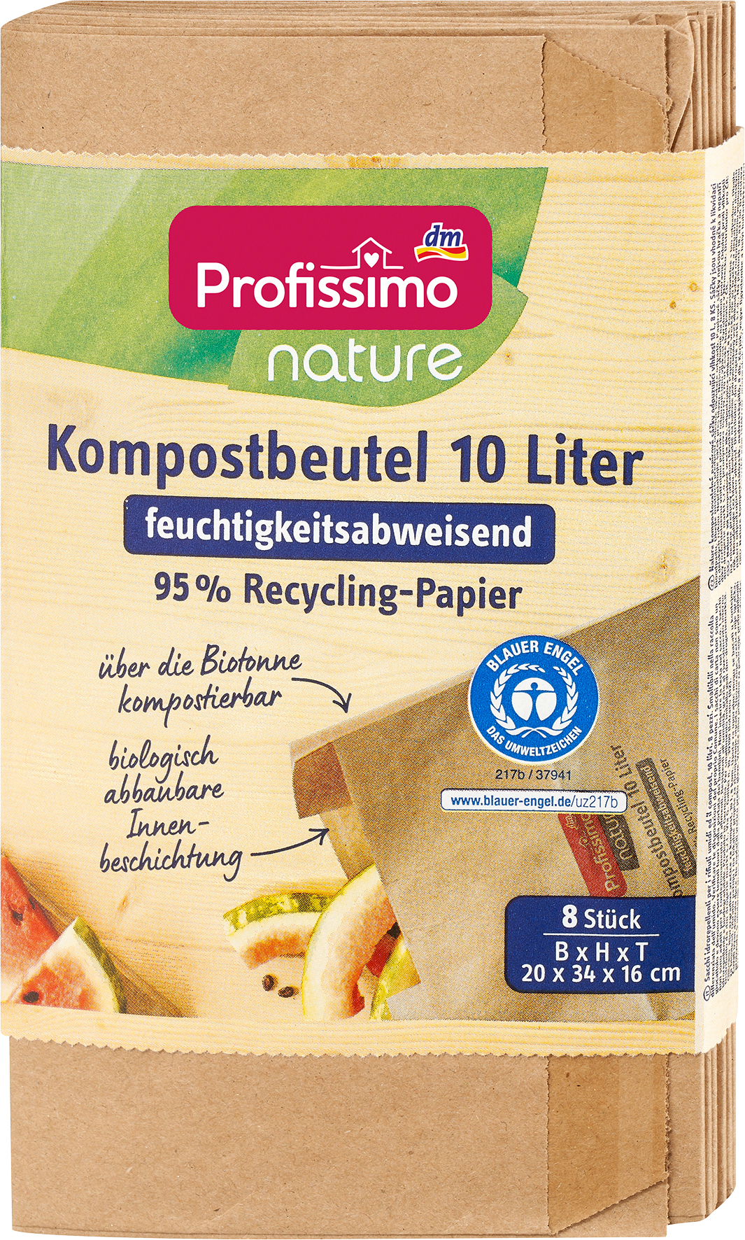 أكياس السماد الطبيعي Profissimo قابلة للتسميد وطاردة للسوائل وتمكن من التخلص الصحي من النفايات العضوية في السماد المنزلي أو في سلة النفايات العضوية. مناسب بشكل خاص لأي نفايات فواكه وخضروات والشاي والقهوة المطحونة مع ورق الترشيح ونفايات الحدائق والنباتات والبيض. بالإضافة إلى ذلك ، تحتوي الأكياس على طبقة داخلية قابلة للتحلل.