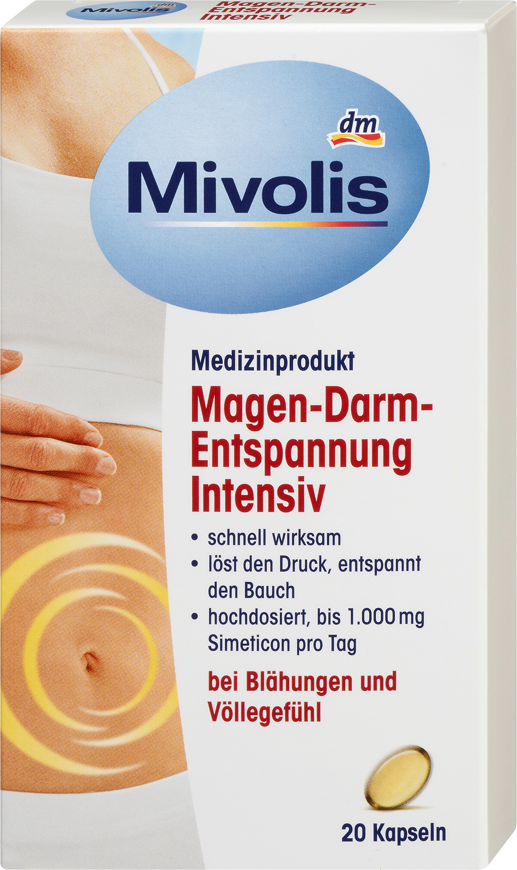 يحتوي Mivolis Gastrointestinal Relaxation Intensive على مكون سيميثيكون الذي تم اختباره سريريا وهو منتج جيد التحمل للمعدة والأمعاء مع تأثير نزع الفتيل. يذيب Simeticon الرغوة في الجهاز الهضمي عن طريق التغيرات المحلية في التوتر السطحي. هذا يؤدي إلى انفجار فقاعات الغاز أو نموها معا وتسهيل إزالتها. لا يمتص الجسم Simeticon ويتم إفرازه دون تغيير. تختفي الأعراض مثل انتفاخ البطن والانتفاخ بشكل موثوق. يسترخي الجهاز الهضمي ويستريح. يعمل Mivolis Gdigestive Relaxation Intensive بسرعة وبلطف. مواصفات المنتج: خالي من اللاكتوز صنع في ألمانيا “}]