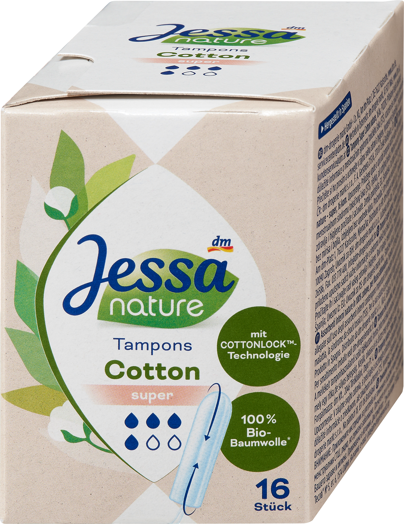 سدادات قطنية طبيعية بحجم سوبر باي جيسا هي الرفيق المثالي خلال الدورة الشهرية. السدادات القطنية مصنوعة حصريا من القطن العضوي وقد تم اختبار توافق الجلد من قبل أطباء الجلدية. يسمح الشكل المطور خصيصا للسدادات القطنية بالتكيف تماما مع الجسم وتوفير حماية موثوقة من التسرب.