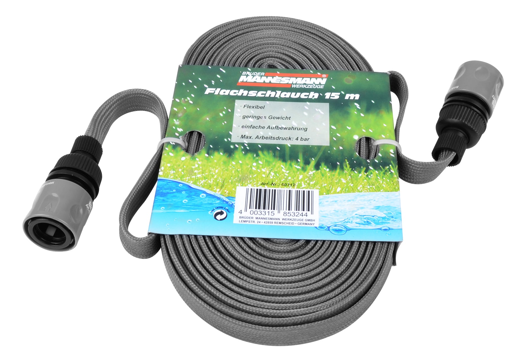يتميز الخرطوم المسطح من Brüder Mannesmann بالمرونة الفائقة والوزن الخفيف ، وهو مثالي لمجموعة واسعة من التطبيقات. مع ضغط عمل أقصى يبلغ 4 بار ، فإنه يوفر الأداء والموثوقية. سهولة تخزينها وطولها 15 مترا تجعلها رفيقا عمليا.