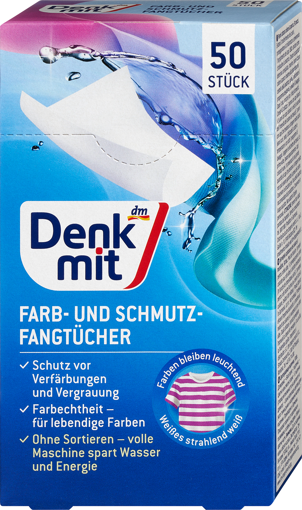 توفر أقمشة جمع الطلاء والأوساخ من Denkmit حماية موثوقة ضد تغير اللون ونقل اللون غير المرغوب فيه أثناء الغسيل. مع الألياف المصنوعة من مواد خام متجددة ، فإنها تمتص الأصباغ الذائبة بشكل موثوق وتحتفظ بإشراق الألوان واللون الأبيض. في الوقت نفسه ، يقومون بتنعيم الألياف الخشنة والعناية بالمنسوجات بحيث تبدو جديدة لفترة أطول. حل عملي للغسيل الفعال واللطيف.صنع في ألمانيا”}]