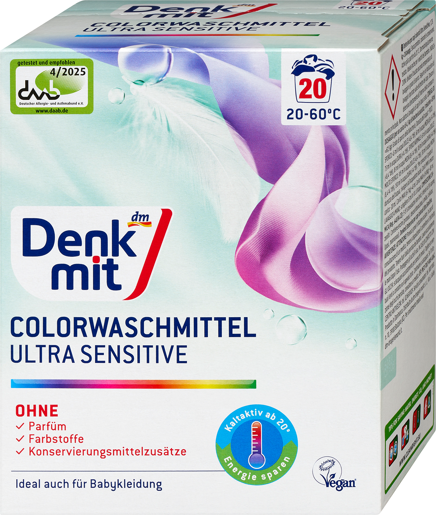 يوفر منظف الغسيل الملون Ultra Sensitive من Denkmit تنظيفا شاملا للغسيل الملون وقد تم تطويره خصيصا للبشرة الحساسة. لا تحتوي التركيبة التي تم اختبارها من قبل أطباء الجلدية على عطر أو أصباغ أو مواد حافظة. بفضل تقنية الإنزيم المبتكرة ، يتغلغل المنظف بعمق في الألياف ويزيل حتى الأوساخ غير المرئية. في الوقت نفسه ، يحمي الألوان والألياف ، بحيث تبدو المنسوجات جديدة لفترة أطول.