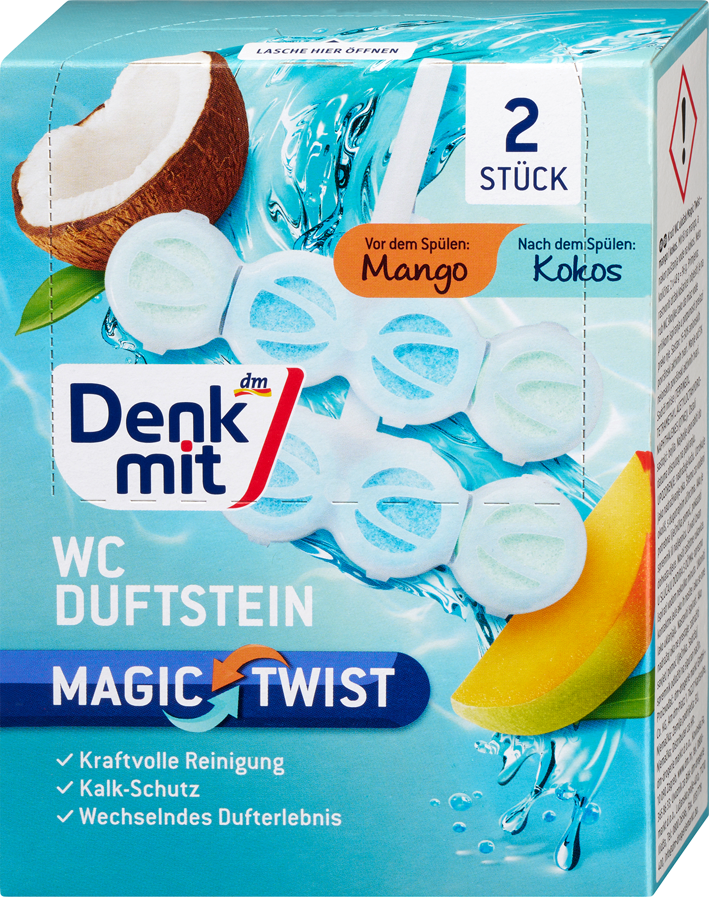يقدم حجر عطر المرحاض Magic Twist في نوع المانجو وجوز الهند من Denkmit حلا مبتكرا للتنظيف والنضارة في منطقة المرحاض. مع كل دورة غسيل ، فإنه يوفر تجربة عطر متغيرة: قبل الشطف ، ينضح برائحة فاكهة المانجو ، بينما بعد الشطف ، تتكشف رائحة جوز الهند الغريبة. يمنع المزيج الخاص من المكونات النشطة بشكل موثوق تكوين الأوساخ من الترسبات الكلسية ومقياس البول ويزيل الرواسب. هذا لا يضمن النظافة مع كل دورة غسيل فحسب ، بل يخلق أيضا نضارة طويلة الأمد في غرفة المرحاض. منتج عملي لمنزل لطيف ونظيف.مواصفات المنتج: معطر اللون الأساسي: أزرق الملمس / الاتساق / التطبيق: أغطية / علامات التبويبتحذير