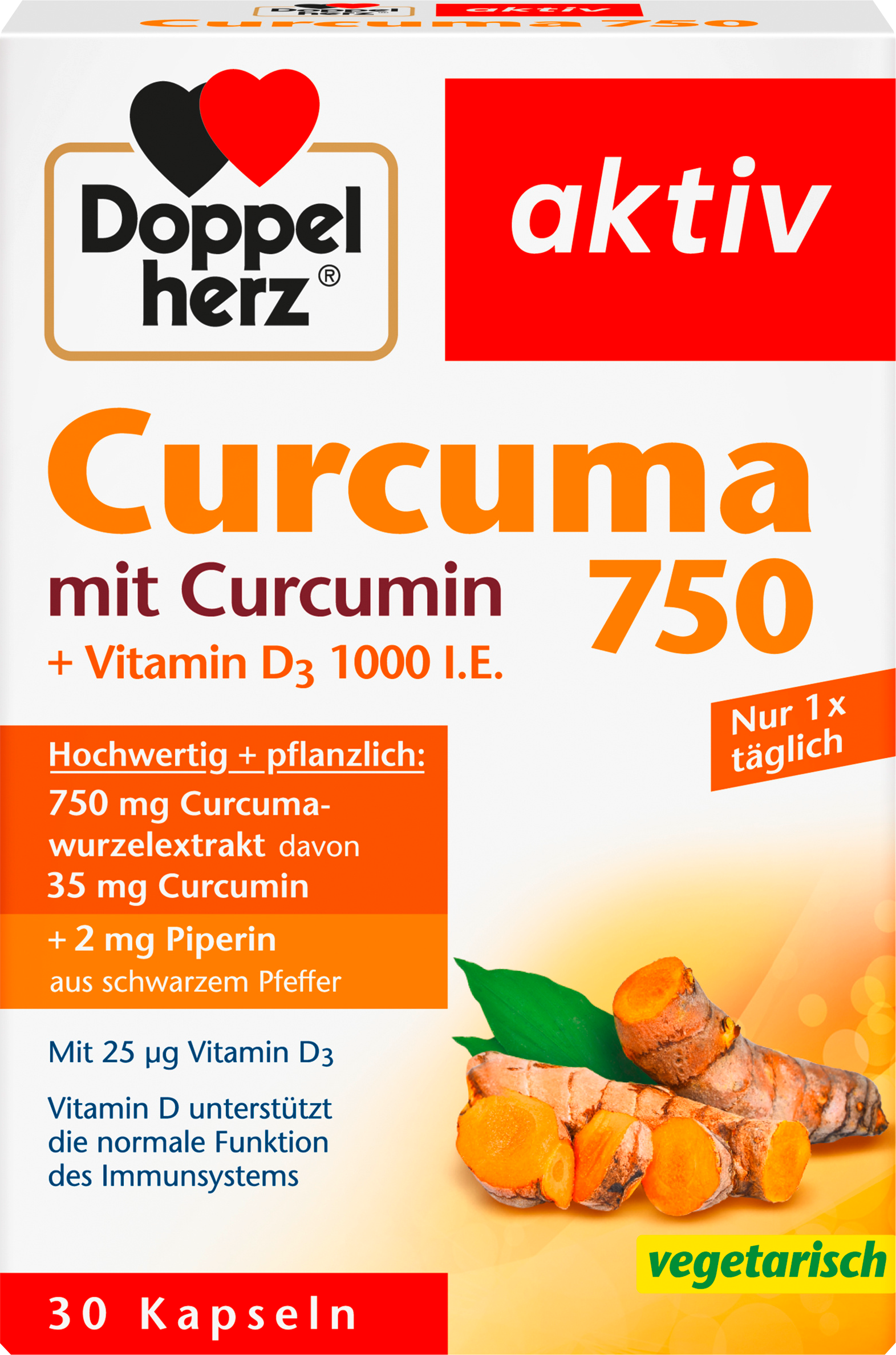 تحتوي كبسولات Doppelherz Curcuma 750 على 750 مجم من مستخلص جذر الكركم عالي الجودة (من Curcuma Longa L.) مع محتوى طبيعي من الكركمين يبلغ 35 مجم مع 2 مجم بيبيرين و 25 ميكروغرام من فيتامين D3 ، وهو ما يعادل 1000 وحدة دولية (وحدات دولية). تحتوي على مستخلص جذر الكركم عالي الجودة مع قشرة كبسولة نباتية.مواصفات المنتج: خالي من اللاكتوز ، خالي من الغلوتين ، نباتي “}]