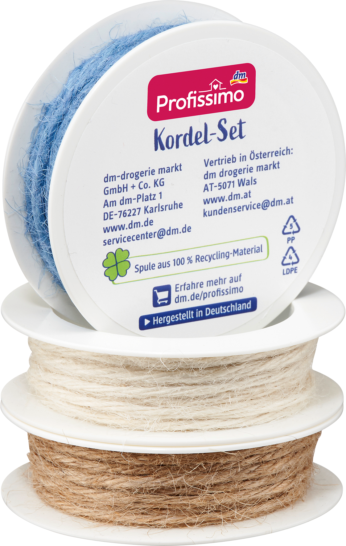 تتضمن المجموعة: 1x سلك أزرق فاتح ، 1x كريم الحبل ، 1x بني سلك (3 أمتار لكل منهما) البكرة مصنوعة من مواد معاد تدويرها بنسبة 100٪ مثالية للتغليف والتزيين صنع في ألمانيا