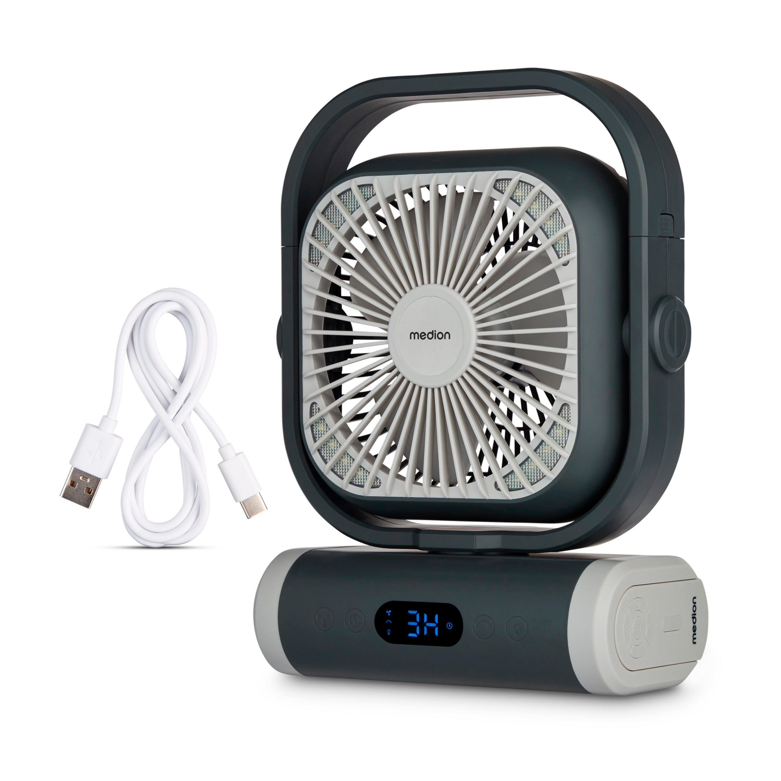 الميزات الرئيسية قوة 20 واط معدل تدفق الهواء 4 م / ث 110 درجة تذبذب أفقي خيارات الضبط الرأسي 5 مستويات سرعة 2 أوضاع قابلة للتعديل: عادي ، متذبذب وظيفة المؤقت (10 ساعات) تصميم صغير بارتفاع 33 سم بطارية مدمجة (10,000 مللي أمبير) وظيفة بنك الطاقة عبر منفذ USB-A و USB-C (5 فولت / 2 أمبير) خطاف قابل للطي في الأسفل لتعليق ضوء LED – 3 مستويات سطوع قابلة للتعديل تشغيل العرض عبر التحكم باللمس أو مغلقة جهاز التحكم عن بعد عدد شفرات الدوار 3 (القطر: 15 سم) مستوى الضوضاء بحد أقصى 48 ديسيبل