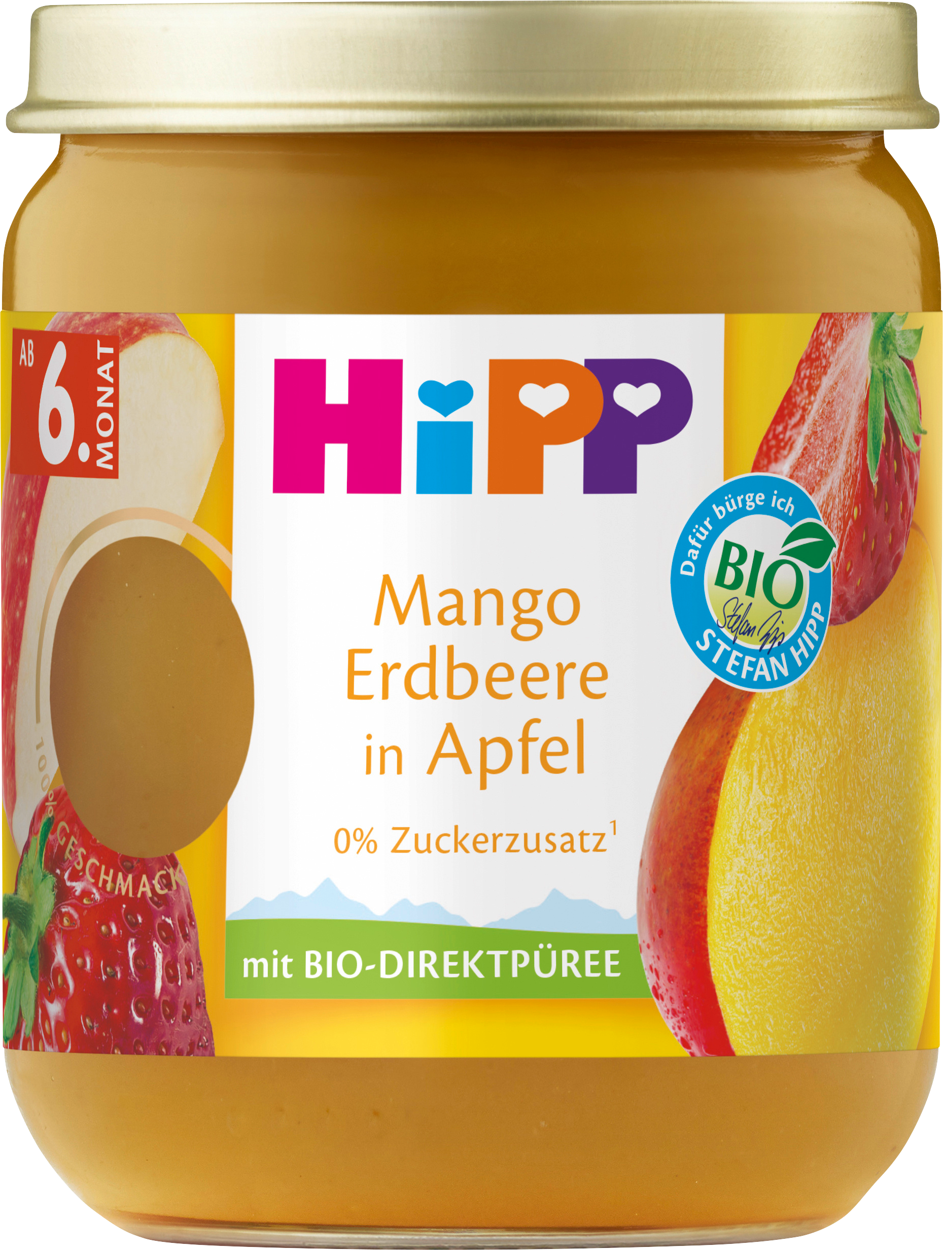 المذاق: مانجو وفراولة في تفاح مناسب للأطفال من سن 6 أشهر معالجة صديقة للمذاق بدون سكر مضاف (يحتوي على سكر طبيعي)