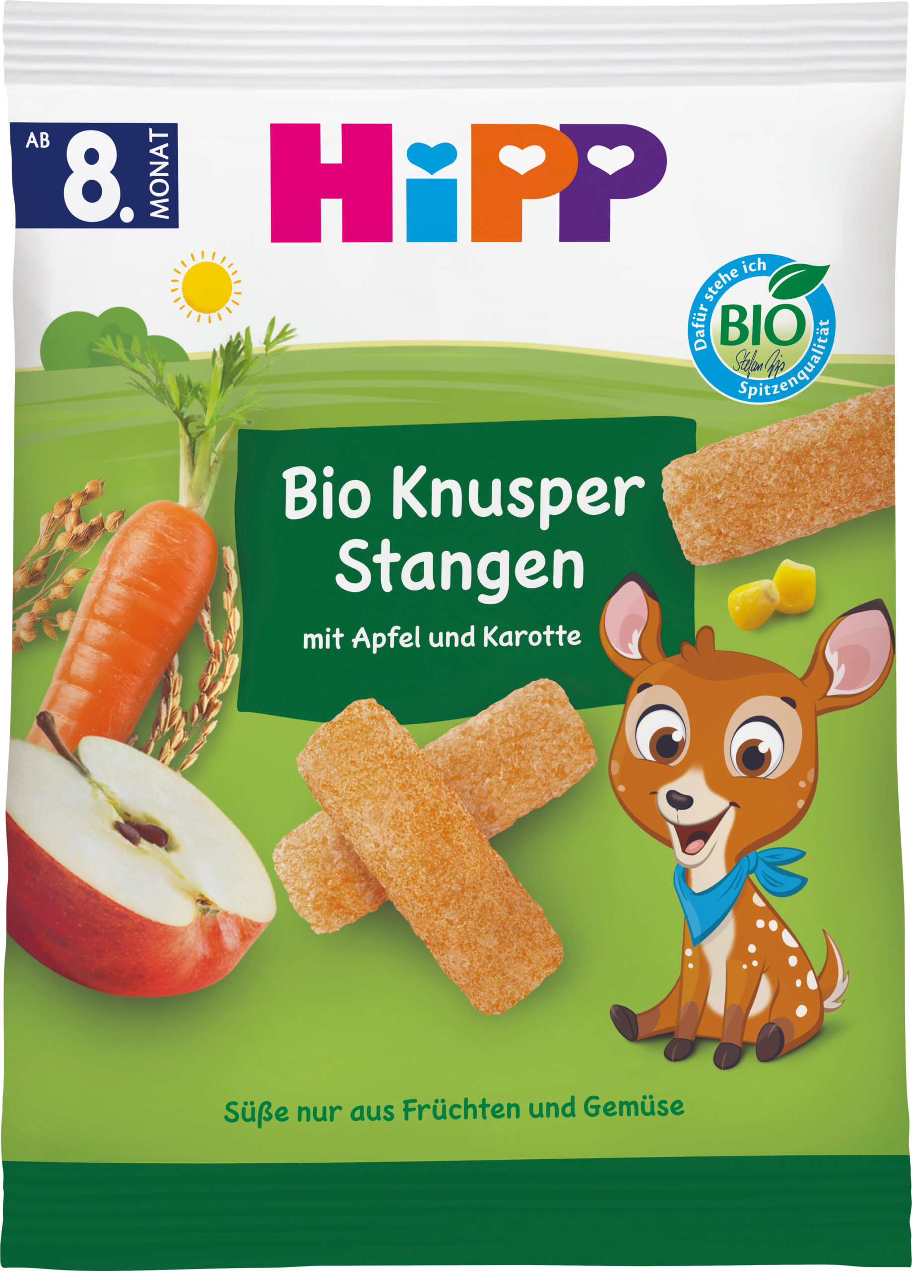 أعواد مقرمشة مع التفاح والجزر يركز العصير العضوي على ألوان التفاح والجزر المكرر من عمر ثمانية أشهر. مثالي للأيدي الصغيرة