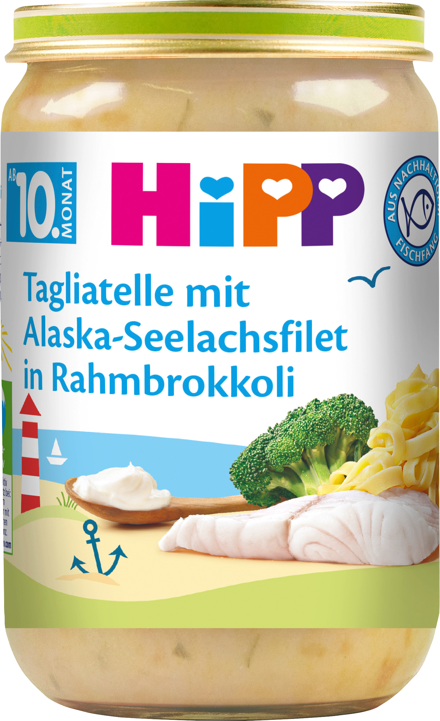 HiPP MEN ü Tagliatelle مع فيليه بولوك ألاسكا في البروكلي بالكريمة من الشهر العاشر ، 220 جرام طعام تكميلي