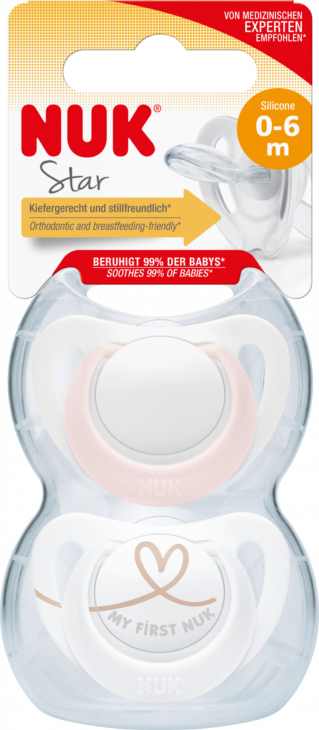 لهايات NUK Star في عبوة من 2 بحجم 1 وردي / أبيض لها شكل تقويم الأسنان ، وتشعر بالراحة في الفم وتترك مساحة لامتصاص اللسان بشكل طبيعي. ولأنها ضيقة جدا ومسطحة الشكل ، فإنها بالكاد تمارس أي ضغط على الأسنان والفك. هذا يعني أن نمو الفك والأسنان بالكاد يضعف. من أجل الاستدامة ، تأتي مصاصة NUK هذه في صندوق قوي وقابل لإعادة الاستخدام يحافظ على نظافتها ويحميها – وهو حل مثالي ، خاصة أثناء التنقل. كما أنها مناسبة للتنظيف الصحي في الميكروويف. توصية العمر: منذ الولادةالمادة: سيليكون “}]