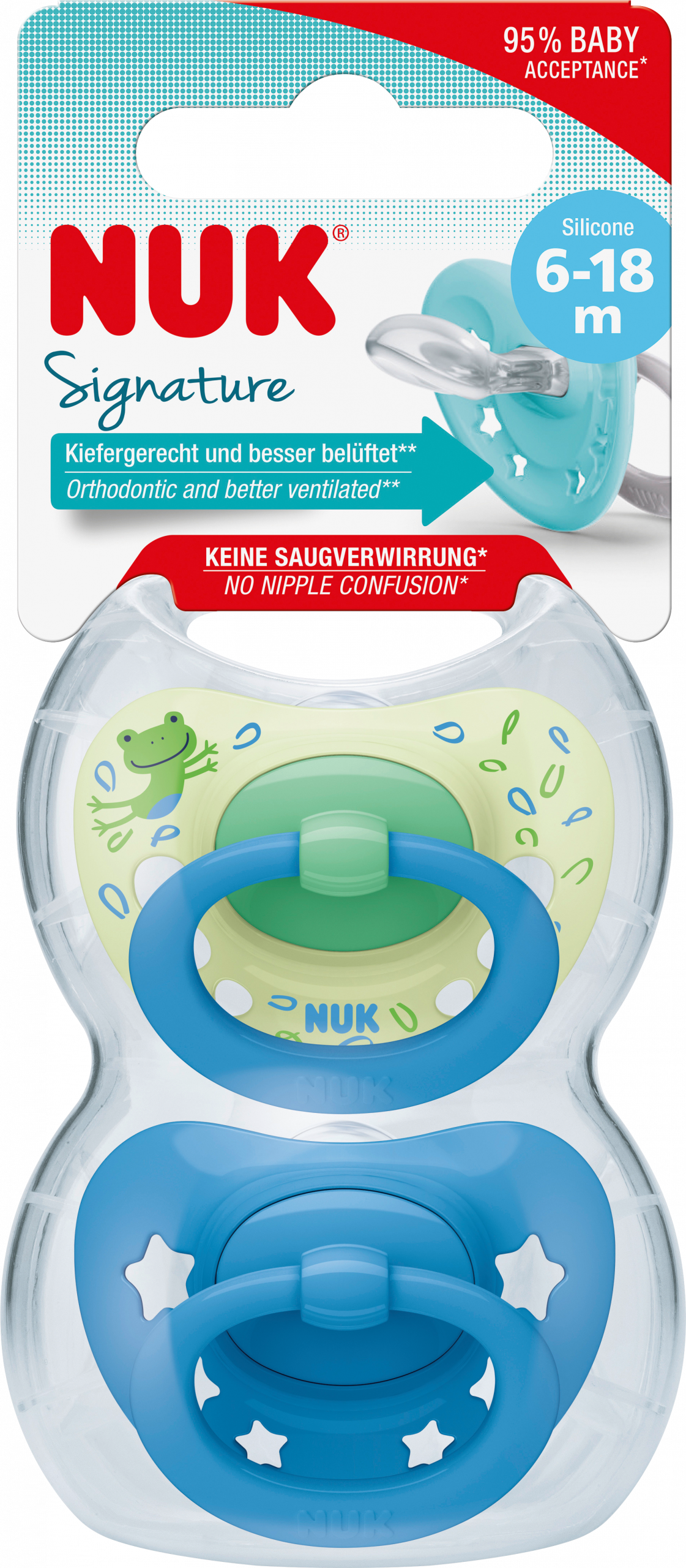 NUK لهاية سيجنتشر سيليكون ، أخضر / أزرق ، 6-18 شهرا ، 2 قطعة