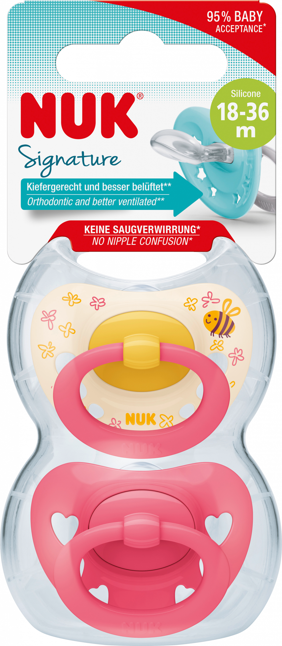 لهايات السيليكون المميزة الخالية من مادة BPA باللونين الأصفر والوردي الرائع من NUK مناسبة بشكل خاص للأطفال الصغار من سن 18 شهرا. بفضل رقبة الحلمة الرفيعة والضيقة ، يمكن تقليل الضغط على الفك والأسنان. بالإضافة إلى ذلك ، يوفر جزء تقويم الأسنان بجانبه السفلي الأملس مساحة أكبر لحركة الشفط الطبيعية. بالإضافة إلى ذلك ، يمكن أن تساهم الحلمة في نمو الفم الصحي. يمكن تخزين اللهايات في صندوق اللهاية العملي وتنظيفها في الميكروويف. تثير لهايات الأطفال الإعجاب أيضا بدرع الفم اللطيف على شكل قلب ، والمجهز بحلقة للإمساك بها. توصية العمر: من 12 شهرا المواد: السيليكون “}]