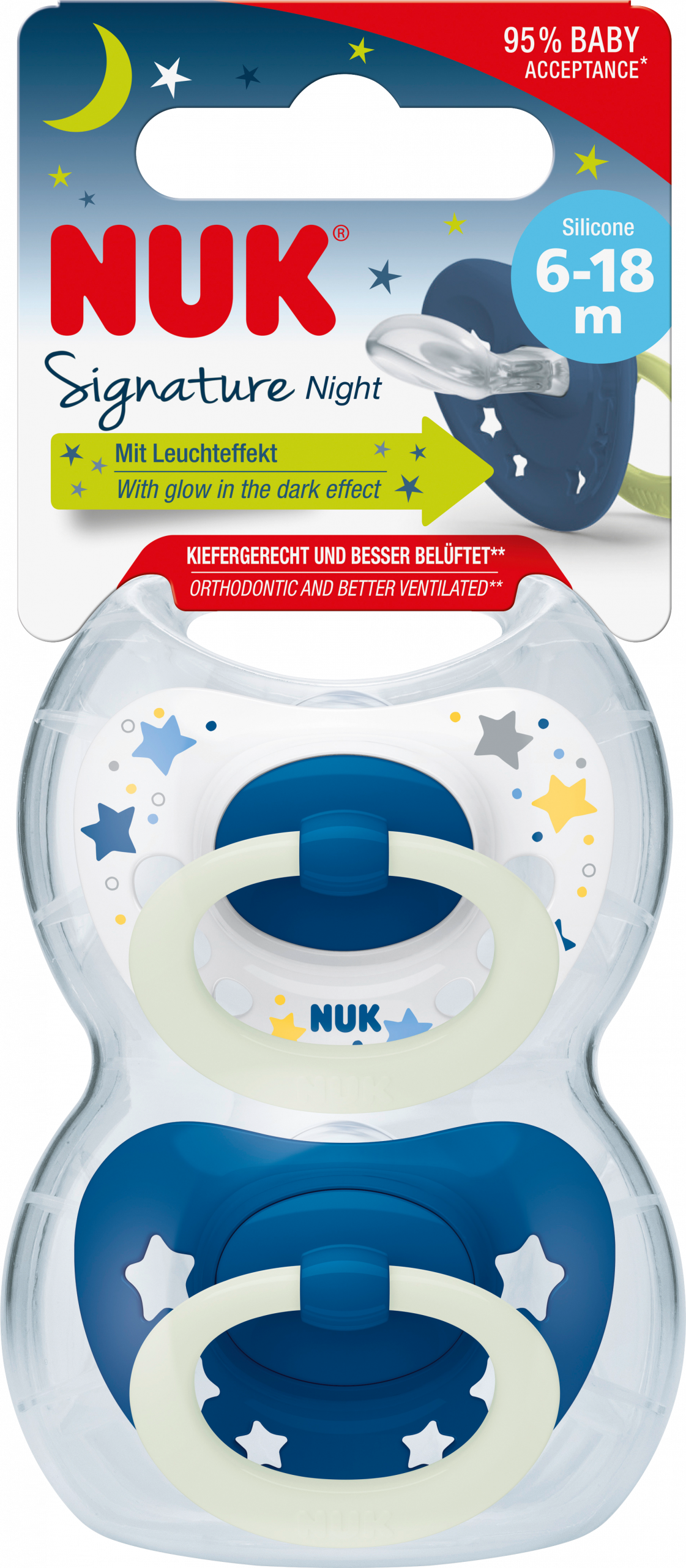 NUK لهاية سيجنتشر سيليكون ليلي ، أزرق ، 6-18 شهرا ، 2 قطعة