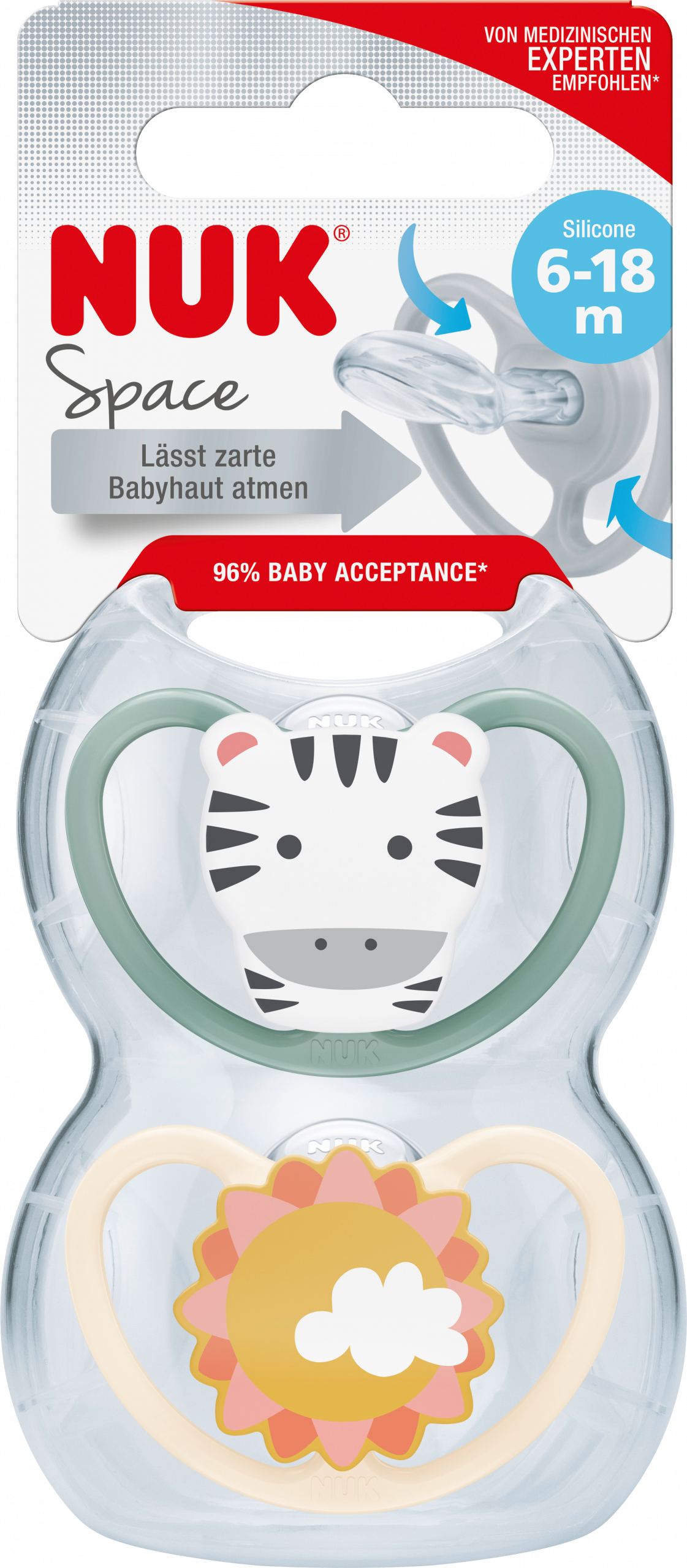مصاصة السيليكون الفضائية ذات اللون الأخضر والمشمش من NUK مناسبة للرضع والأطفال الصغار من سن ستة إلى 18 شهرا. تشعر مصاصة الطفل بالنعومة بشكل خاص في فم الطفل بفضل المنطقة الناعمة في الأعلى. بسبب فتحات الهواء الكبيرة جدا ، يأتي المزيد من الهواء إلى الجلد ويسمح له بالتنفس. بالكاد تتلامس الحافة الضيقة مع الجلد وبالتالي فهي لطيفة على بشرة الطفل الحساسة. يقلل التصميم المسطح والضيق الضغط على الأسنان والفكين. صندوق اللهاية العملي ، الذي يتم فيه توصيل اللهايات ، يحمي من الأوساخ.توصية العمر: من الشهر السادس المواد: سيليكون “}]